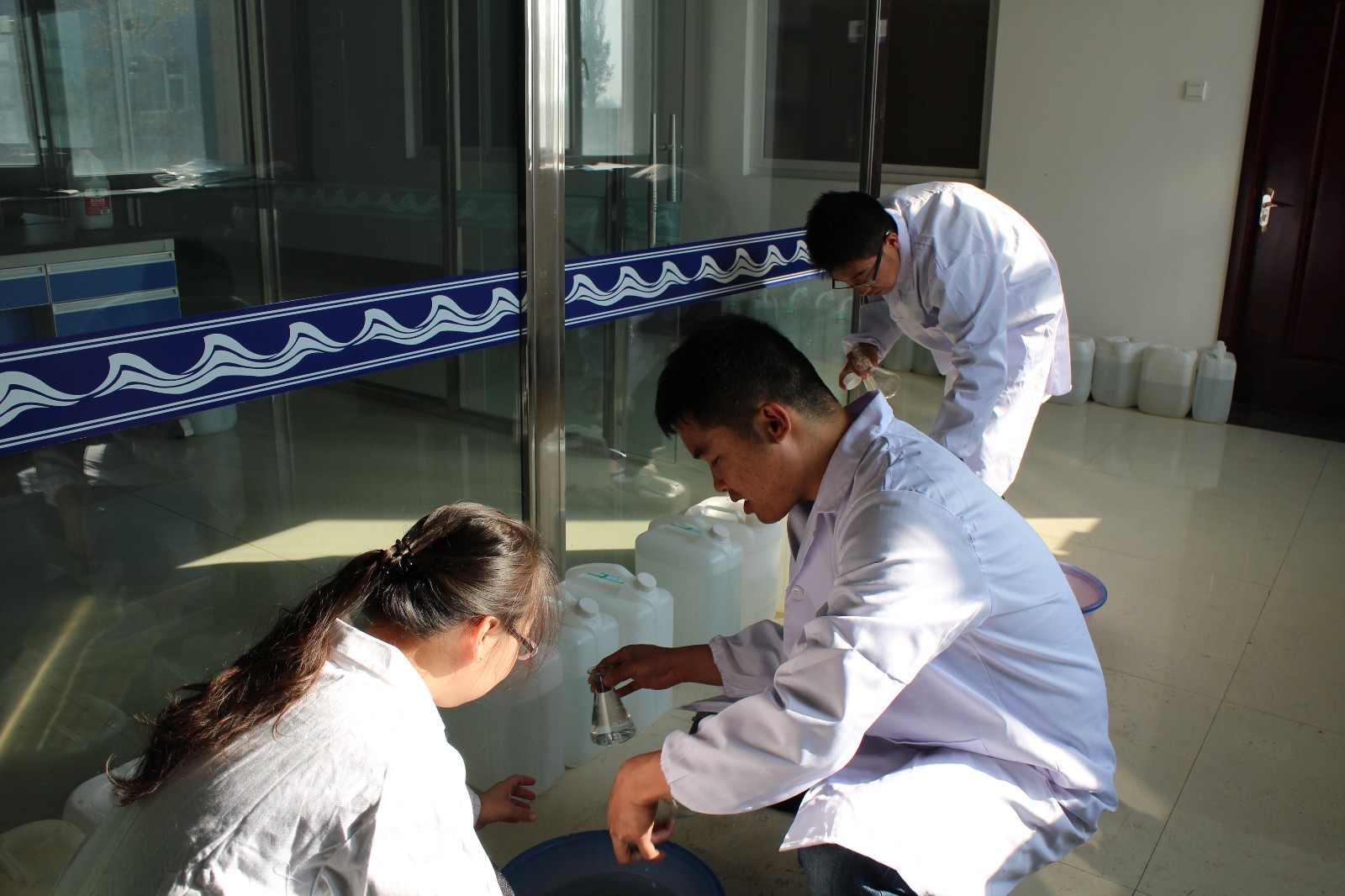 實(shí)驗(yàn)人員采集水樣準(zhǔn)備進(jìn)行檢測