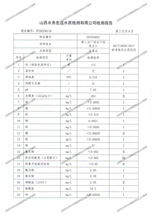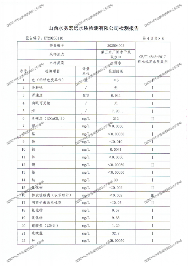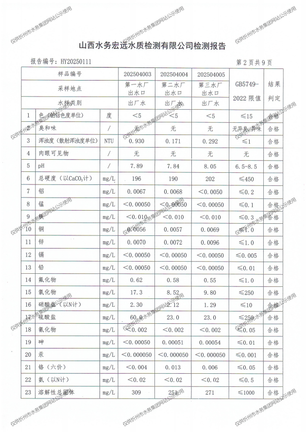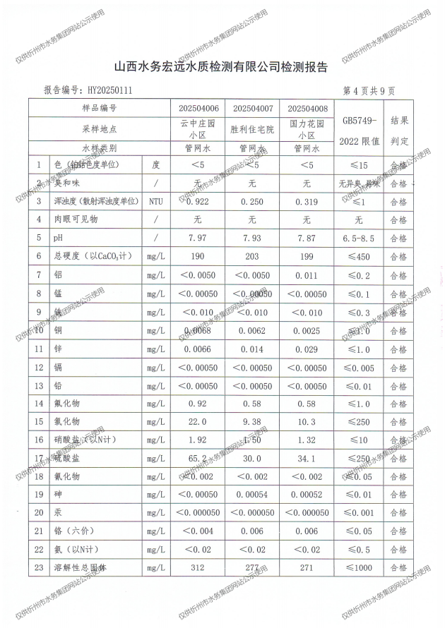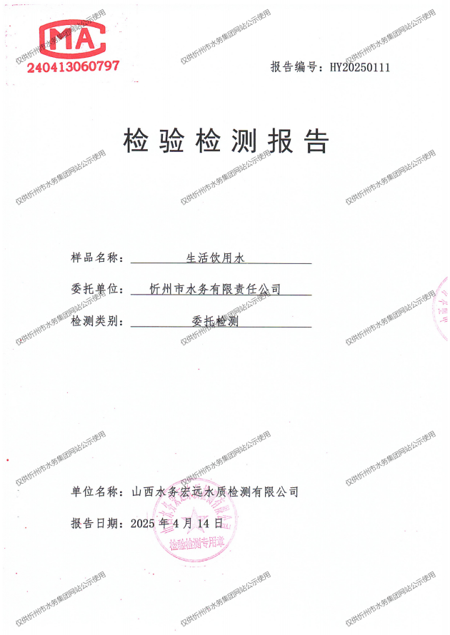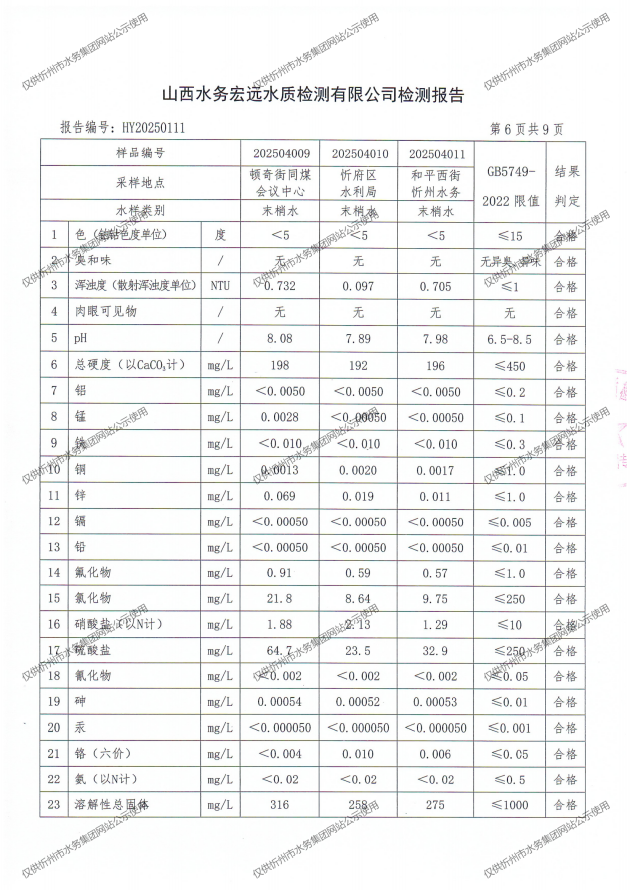 忻州城區(qū)公共供水水源水、出廠水、管網(wǎng)水、管網(wǎng)末梢水2025年4月份水質(zhì)信息公示