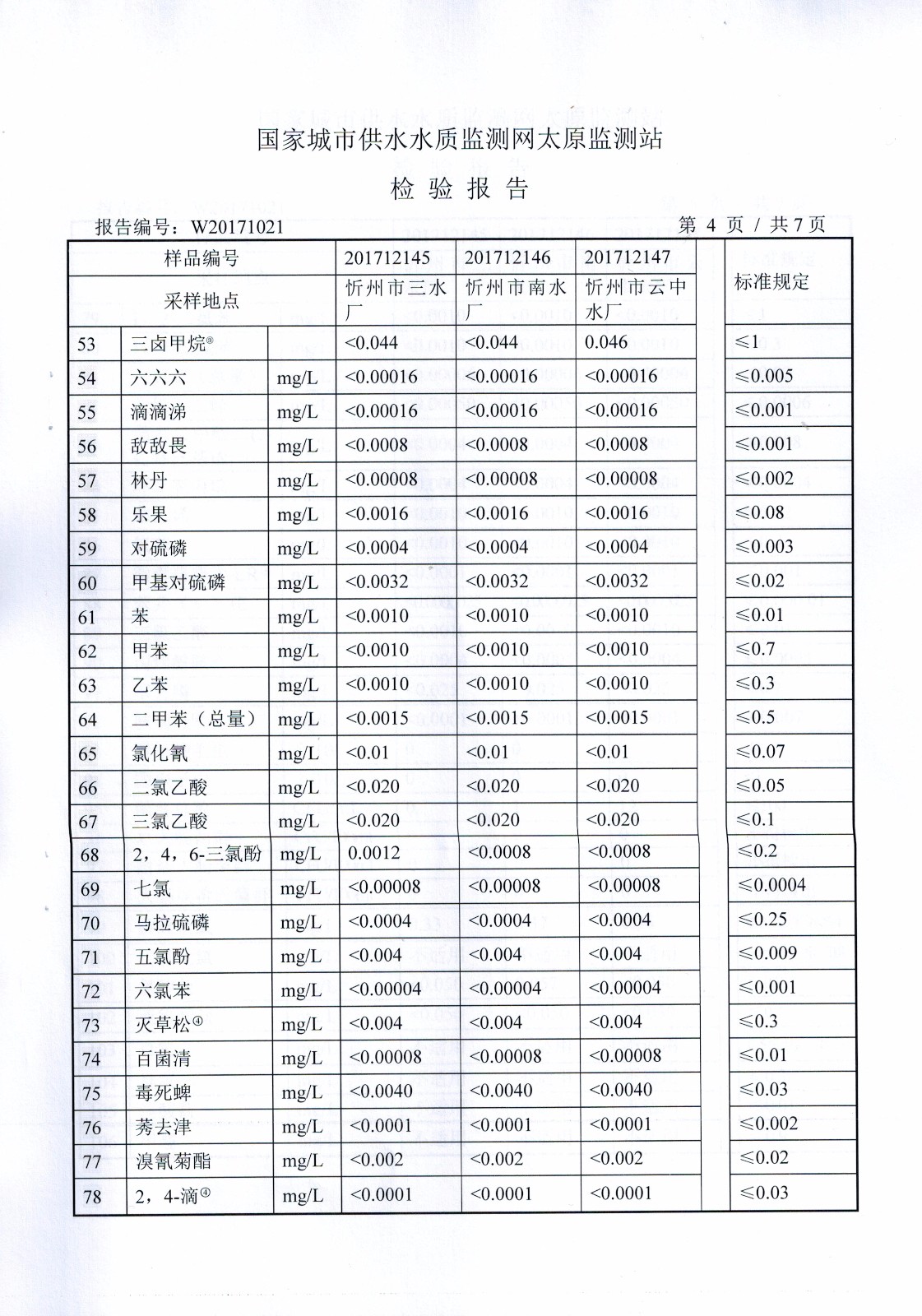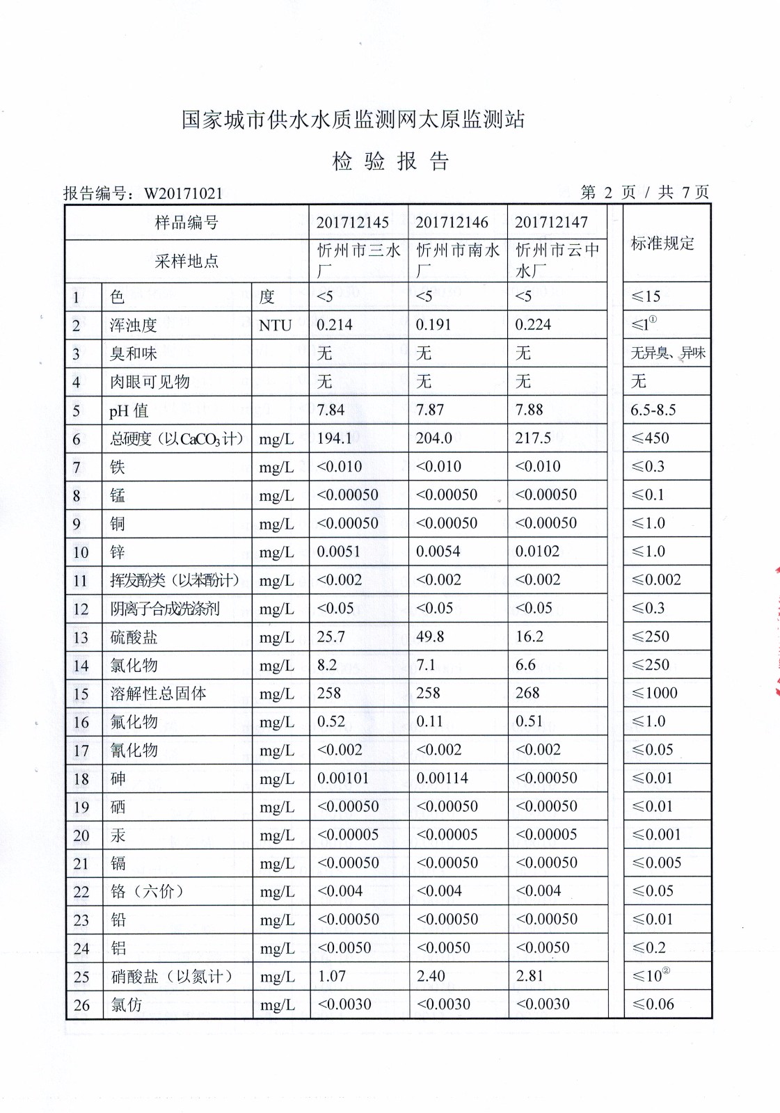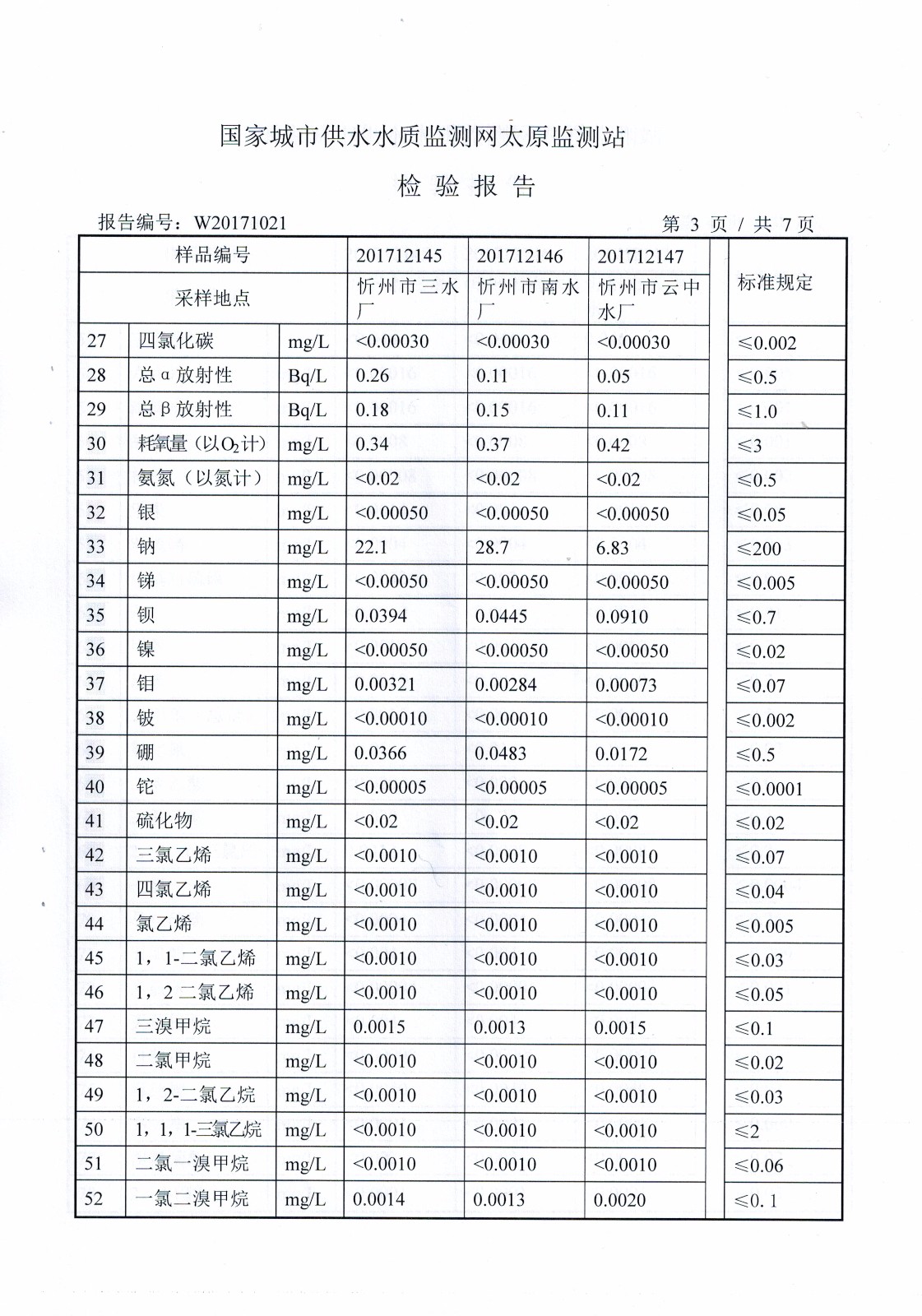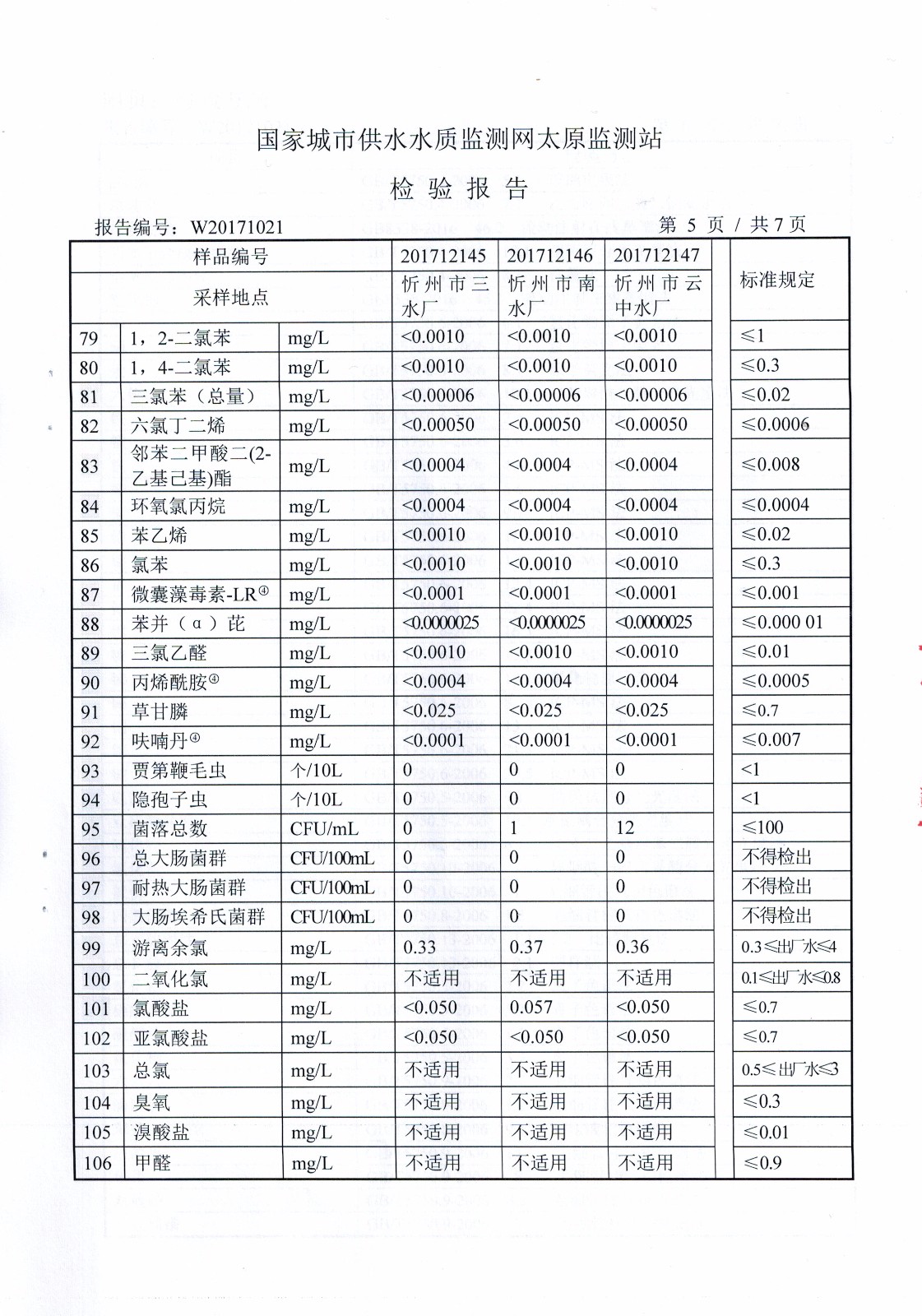 2017年忻州城區(qū)公共供水南水廠、三水廠、云中水廠出廠水106項水質全分析