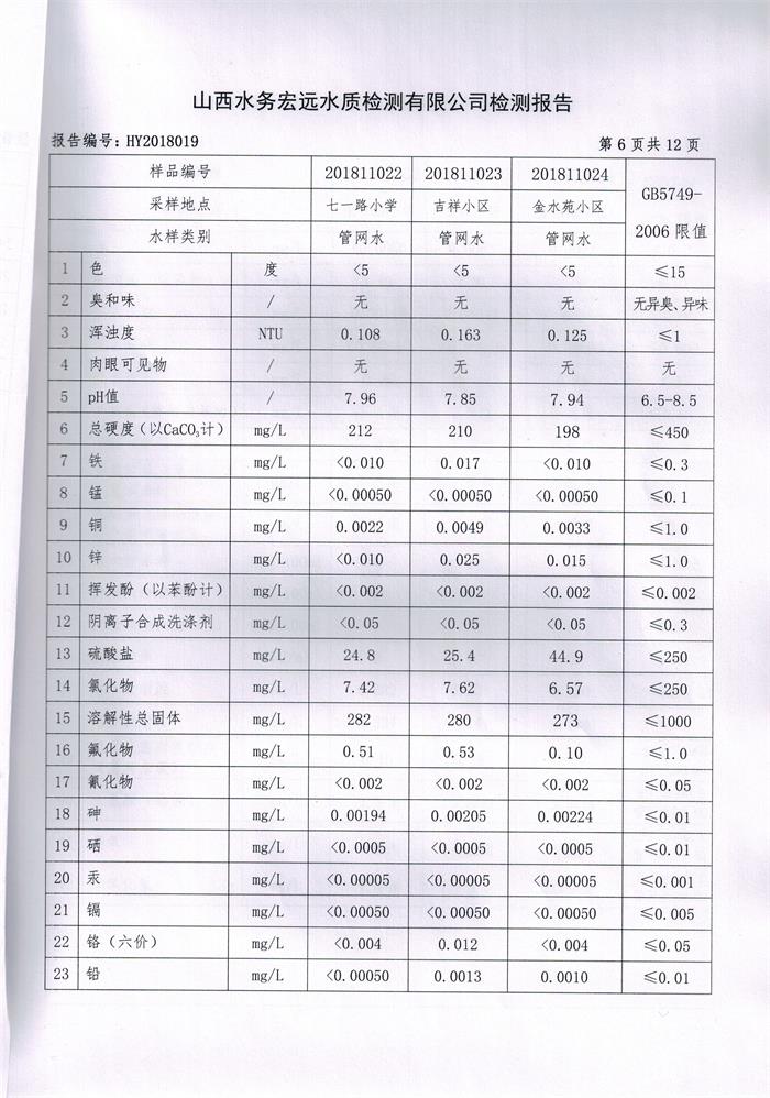 忻州城區(qū)公共供水水源水、出廠水、管網(wǎng)水、管網(wǎng)末梢水2018年11月份水質(zhì)信息公示