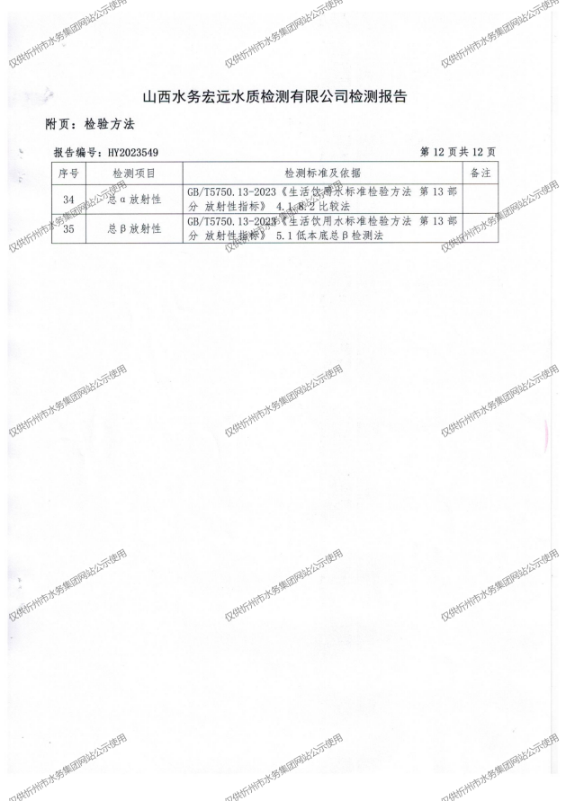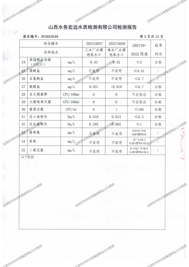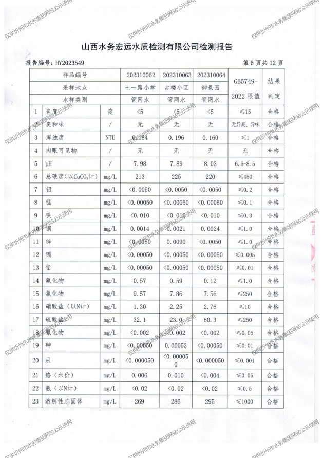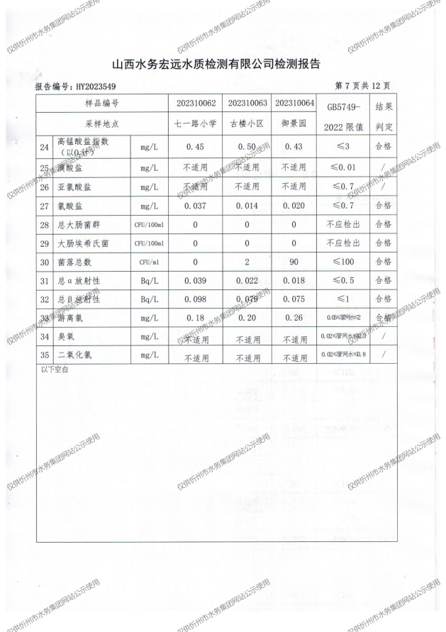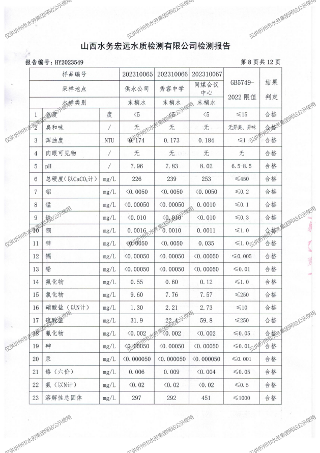 忻州城區(qū)公共供水水源水、出廠水、管網水、管網末梢水2023年10月份水質信息公示